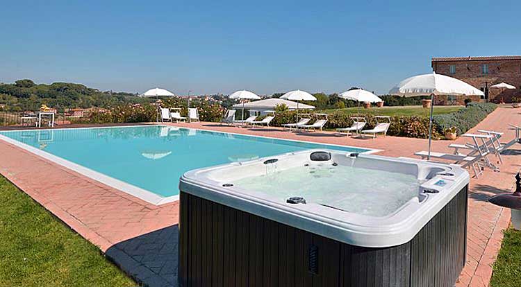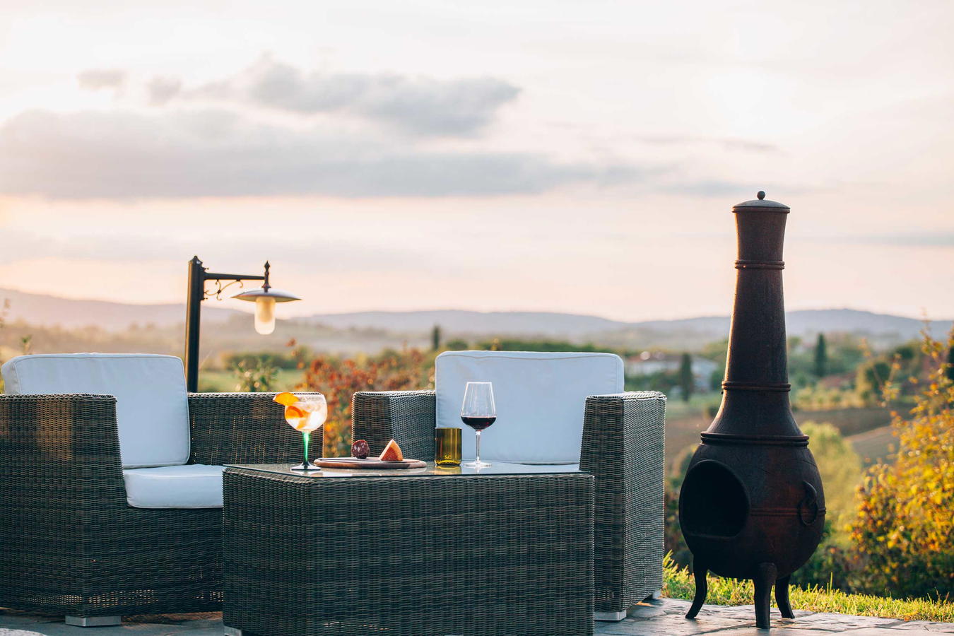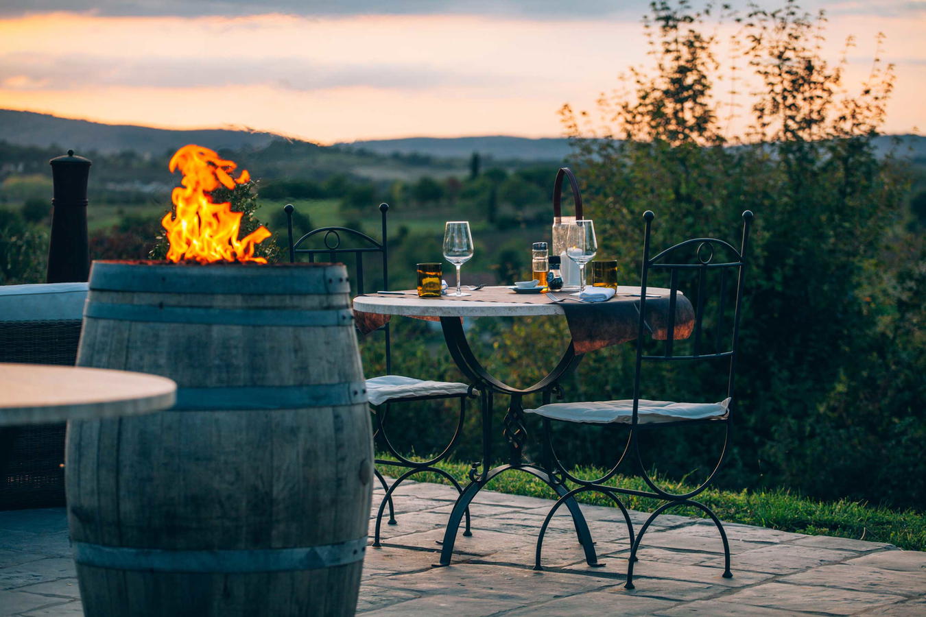 La vista dal giardino e dalla piscina di Casale Cardini spazia libera nell'orizzonte che sembra distendersi all'infinito, mostrando tutto il bello di quest'area della Toscana meridionale. I campi di grano alternati a quelli di girasoli circondano la tenuta, offrendo il contesto ideale da scegliere se si ha intenzione di celebrare in Toscana matrimoni ed eventi in generale. L'arredo in tipico stile rurale toscano è messo in evidenza dal contrasto con i diversi accessori moderni, che insieme creano la giusta atmosfera per trascorrere una serena vacanza in Toscana.