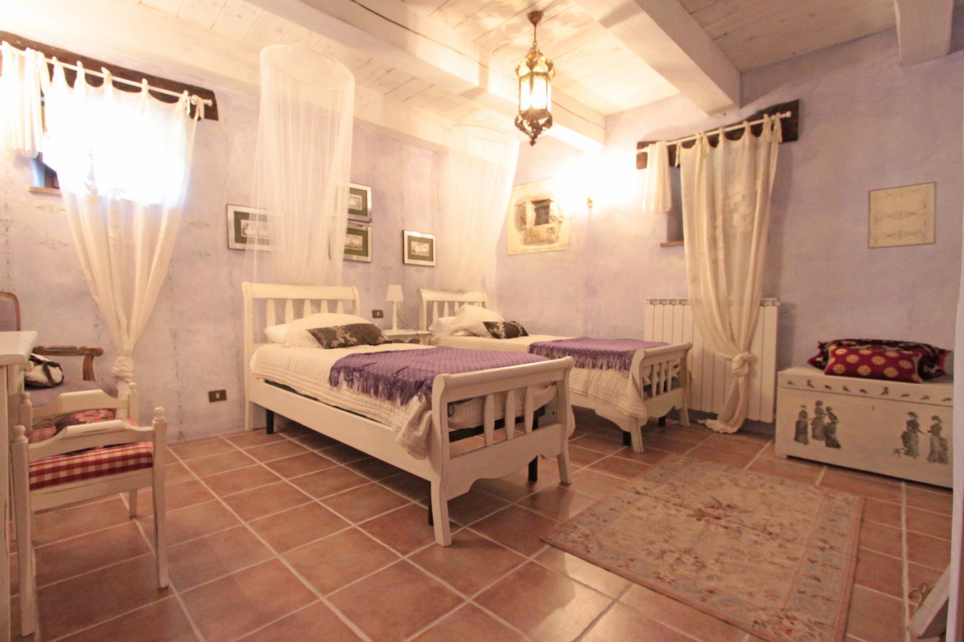 Il più grande dei due edifici della villa La Loggia Fiorita è dotato di 5 camere da letto, disposte sue due piani: quella principale ha il proprio bagno esclusivo ed è ubicata al piano terra, caratterizzata da un'atmosfera romantica ed un sacco di luce naturale. Sia questa che una delle camere matrimoniali si affacciano sul cortile, dove troverai un accogliente angolino per rilassarti e godere della quiete che domina il paesaggio circostante. Al piano terra si trova anche una camera con due lettini singoli ed il salotto, che ti offrirà lo spazio necessario sia per trascorrere del tempo con gli altri, che per conto proprio nel caso tu preferisca un pò di privacy.