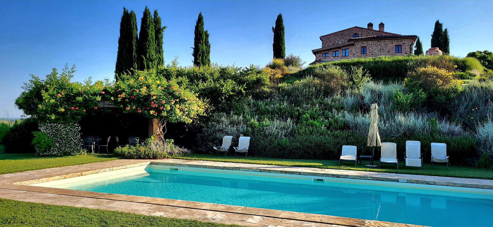 Il parco con le molte varietà di erbe aromatiche vi avvolgerà di profumi ormai dimenticati. L’ orto biologico vi permetterà di assaporare verdure sempre fresche, mentre il barbecue soddisferà la vostra passione per la cucina. Sorseggiare un buon bicchiere di vino toscano guardando i rossi tramonti sarà un’emozione che non dimenticherete!
